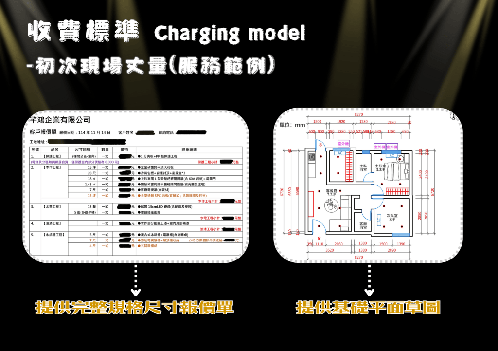 | 施作項目 | 丈量費用 | 工程預算 | 監工費用 |