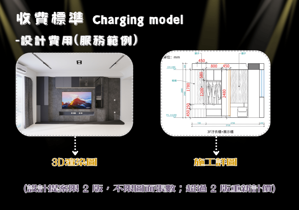 | 設計費用依照工程複雜度由設計師報價 均價$2500~3500元/坪 | 空間設計規劃、2D平面圖、3D模擬圖、施工圖 |